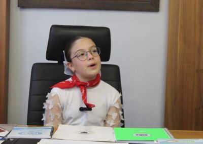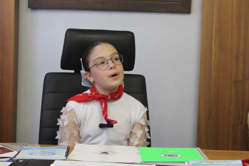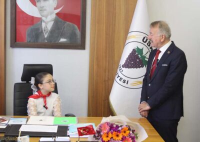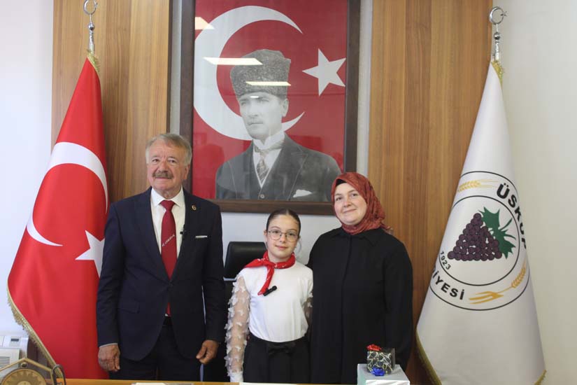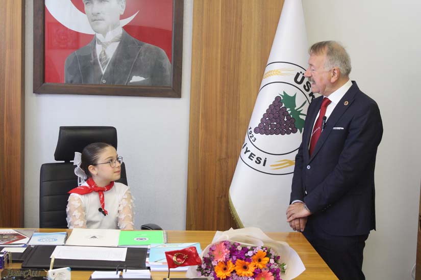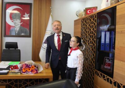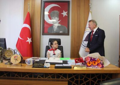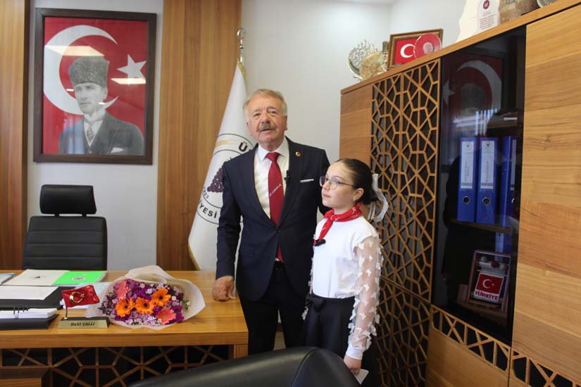 Belediye Başkanımız Halil ÇALLI, 23 Nisan Ulusal Egemenlik ve Çocuk Bayramı dolayısıyla koltuğunu temsili olarak Üsküp Atatürk İlkokulu 4B sınıf öğrencisi Beyza TANIŞ’ a devretti. Ziyaret, öğrenci Buket TANIŞ’ ın Belediye Başkanımız Halil Çallı’ya sunduğu çiçek takdimi ile başladı. Sonrasında koltuğunu yeni Başkan Beyza TANIŞ’ a devreden Belediye Başkanımız, yeni Başkan’ a Üsküp için planlarını ve hayallerini sordu. Temsili olarak başkanlık koltuğuna oturan TANIŞ, okul arkadaşları ve tüm çocuklar adına taleplerini dile getirdikten sonra Belediye Başkanımız Halil ÇALLI’ ya teşekkürlerini sundu. Belediye Başkanımız Halil ÇALLI ise yaptığı açıklamada; “Gazi Mustafa Kemal Atatürk’ün çocuklara armağan ettiği bu müstesna günde, koltuğumuzu Beyza kızımıza devretmekten büyük mutluluk duyduk. Onların gözlerindeki ışık, yarınlarımızın ne kadar parlak olduğunun en büyük kanıtıdır. Konuşmasından dolayı Beyza kızımızı, böyle bir evlat yetiştirdikleri içinse Beyza kızımın ailesini tebrik ediyorum.” şeklinde konuştu.